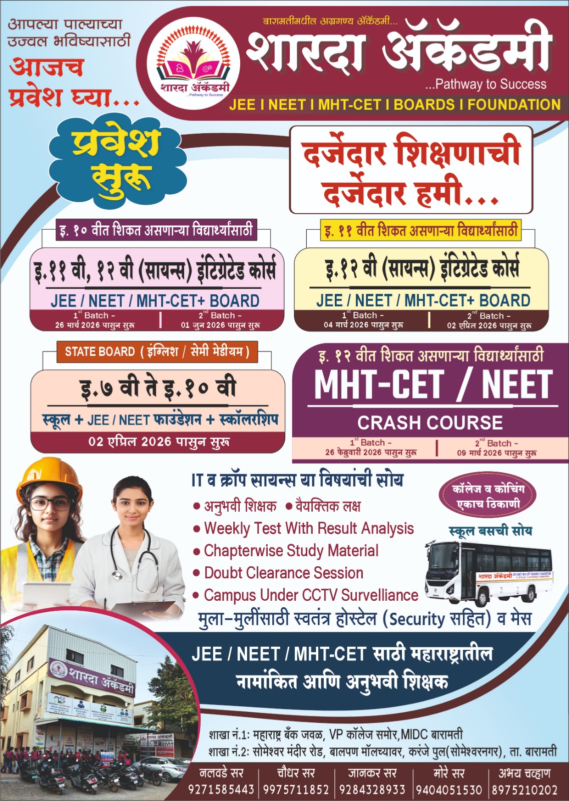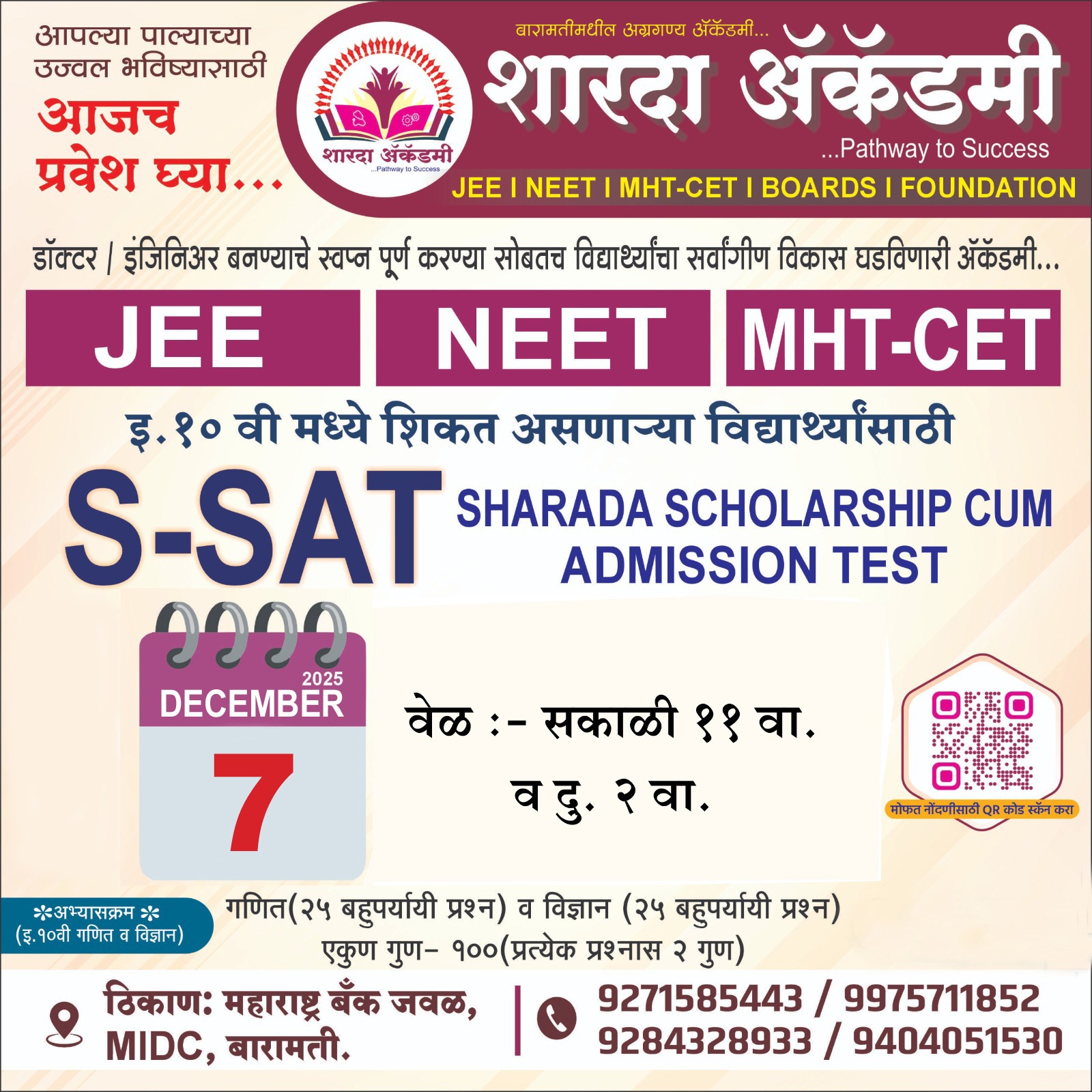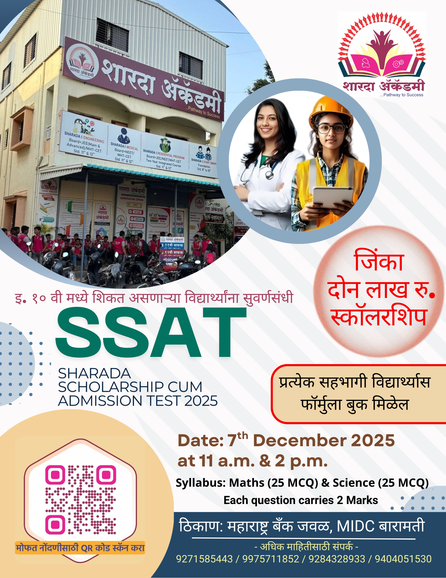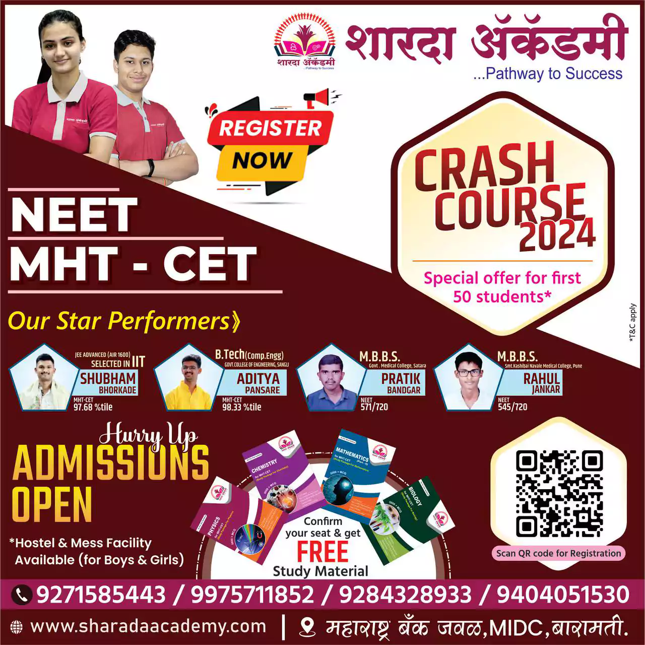 "SHARADA ACADEMY" was started in 2008 with a goal to help students who aspire to take admission for Engineering in IIT/NIT/IIIT/VIT and admission for Medical in AIIMS/Government medical colleges & many others. We focus on providing teaching of the highest standards to the students to empower them to qualify IIT-JEE/NEET/MH-CET/CUET and various other competitive examinations with flying colours. Our genesis lies in exploring the hidden talents of the students and to provide personalized coaching for the best performance.